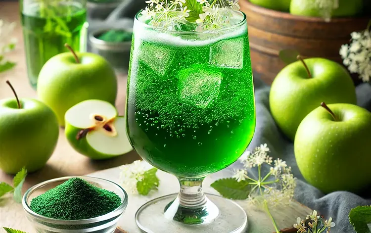Dette blir en utrolig frisk, sprudlende og næringsrik grønn mocktail! Vi bruker chlorella for en kraftig grønnfarge og helsefordeler, mens hylleblomstsirup gir en floral sødme som balanserer friskheten fra grønn eplejuice og sitronmelisse. Shiso tilfører en lett krydret, urteaktig dybde, og boblene fra kombucha eller mineralvann gir den en livlig gnist.